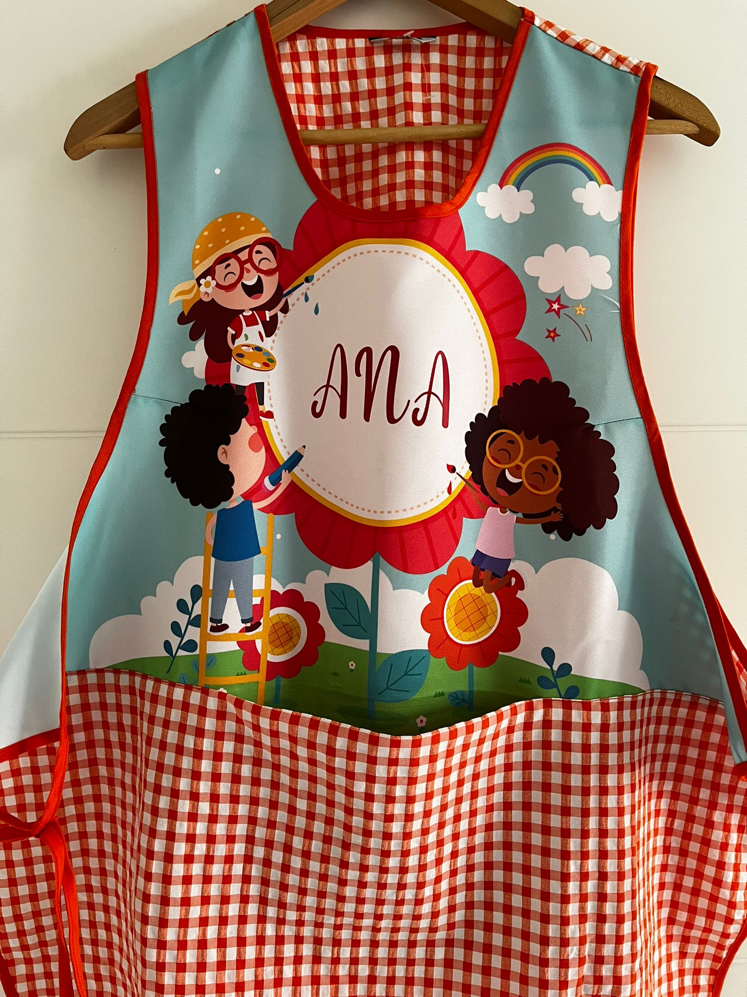 - Un delantal personalizado , diseñado para proteger la ropa durante las actividades del aula. Añade el nombre del profesor, una imagen o una frase motivadora para hacerlo especial.