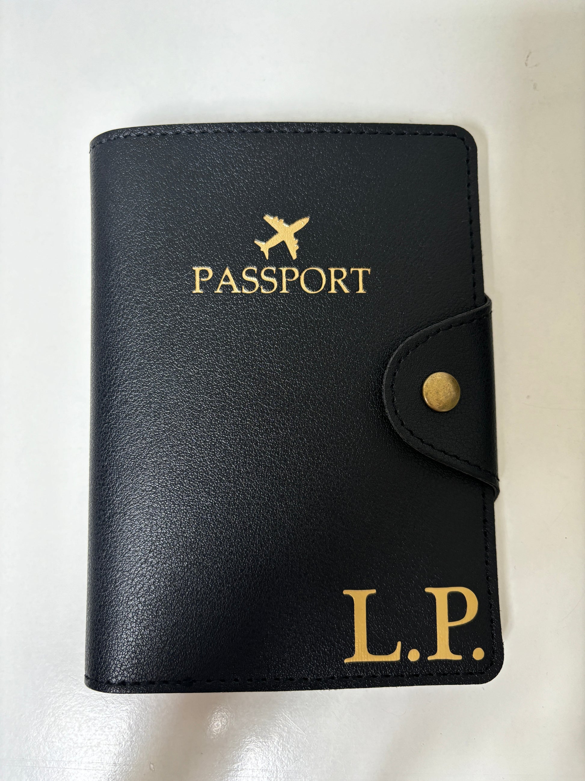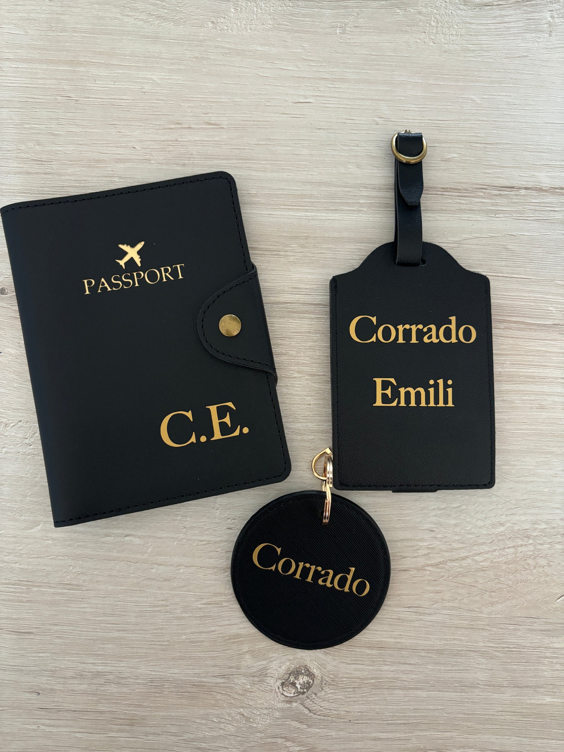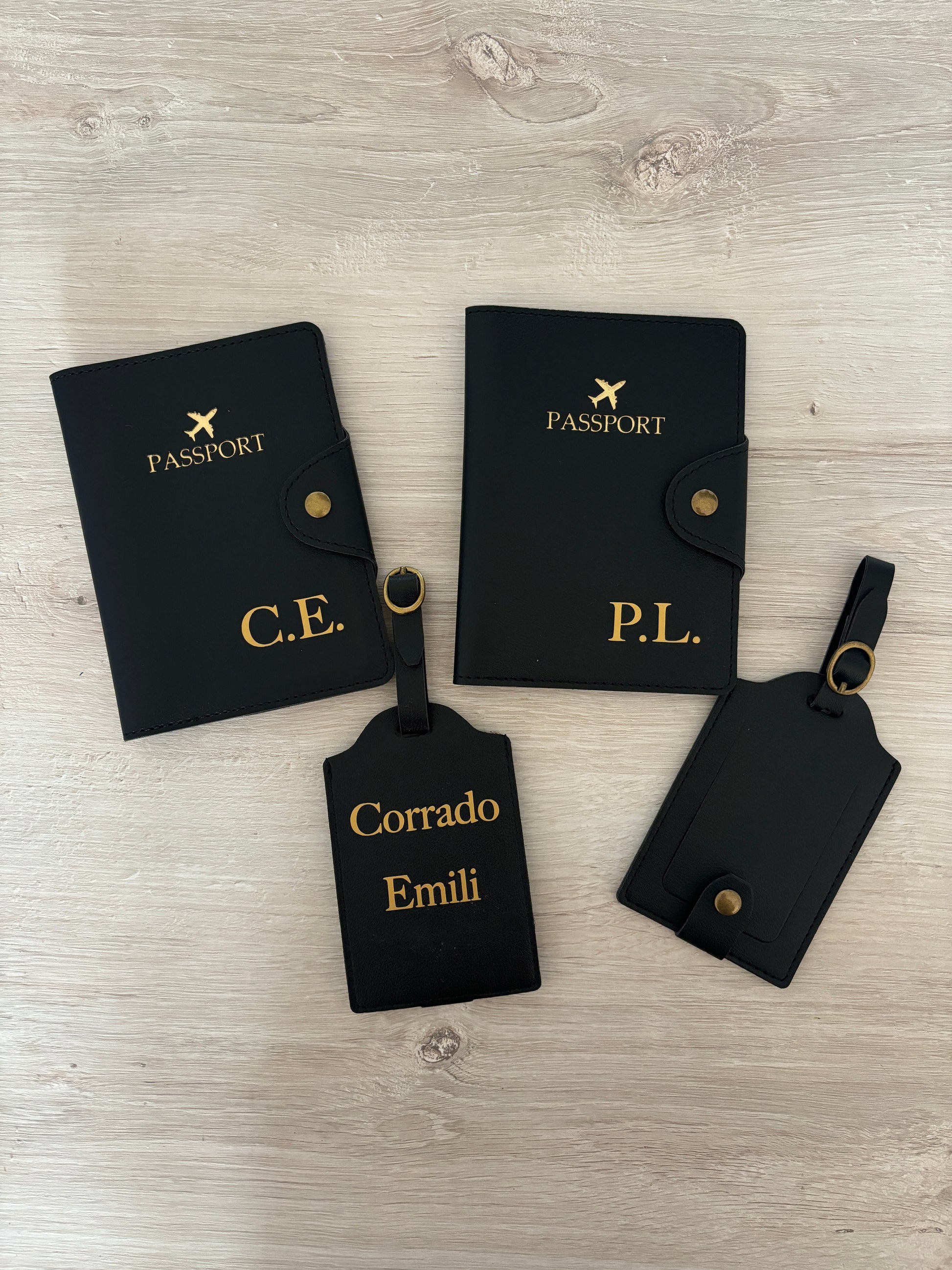 Include portapassaporto con chiusura e etichetta per valigia coordinata, entrambi realizzati in ecopelle premium e personalizzati con nome, iniziali o frase speciale.